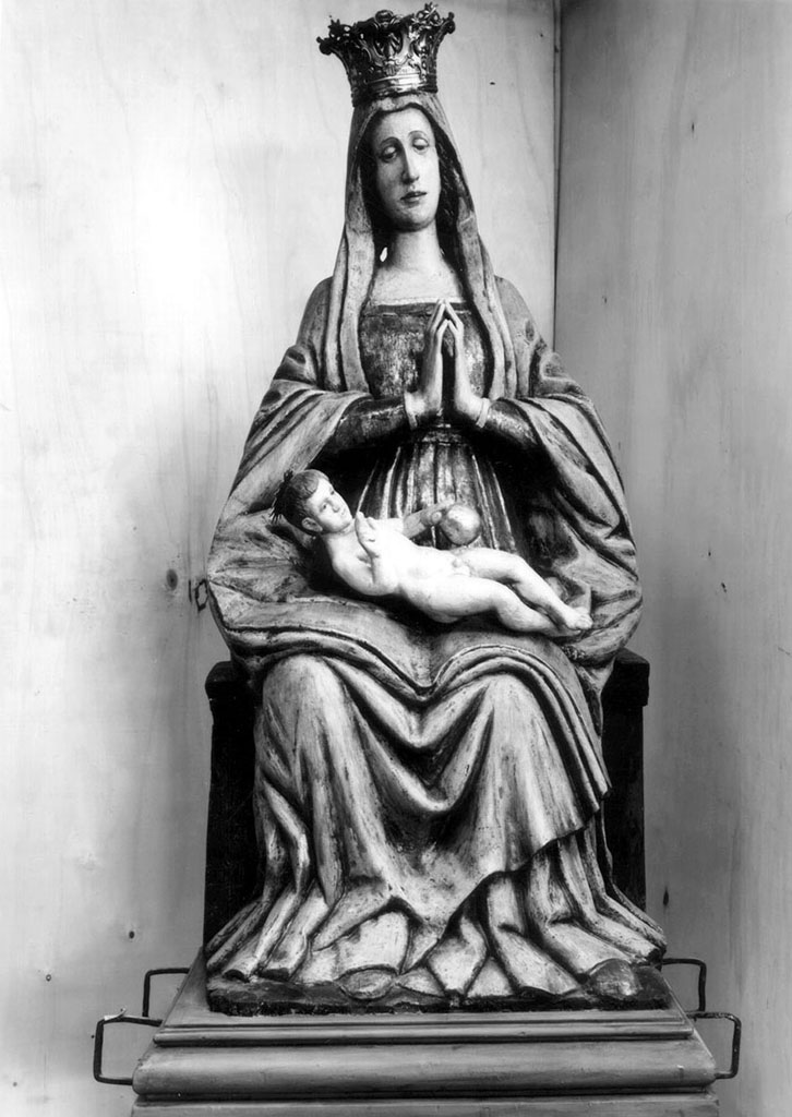 Ignoto, Madonna in trono con Bambino, legno scolpito, dipinto e dorato, sec. XV.