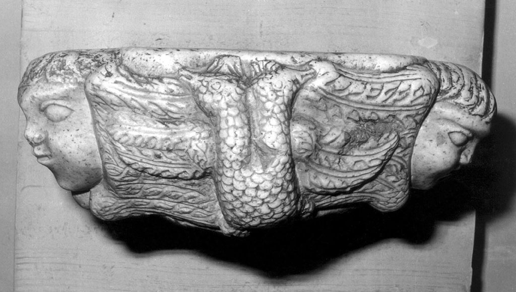 Il manufatto è a immorsatura nel muro. Tale tipo compare nel periodo postcarolingio, quando in Occidente si avverte il bisogno di sostituire l’aspersione pubblica domenicale con il più semplice e frequente uso di segnarsi all’ingresso di una chiesa. L’iconografia legata alle acquasantiere segue la varietà delle soluzioni artistiche adottate nei tempi e nei luoghi. Qui sono due teste di cherubini.