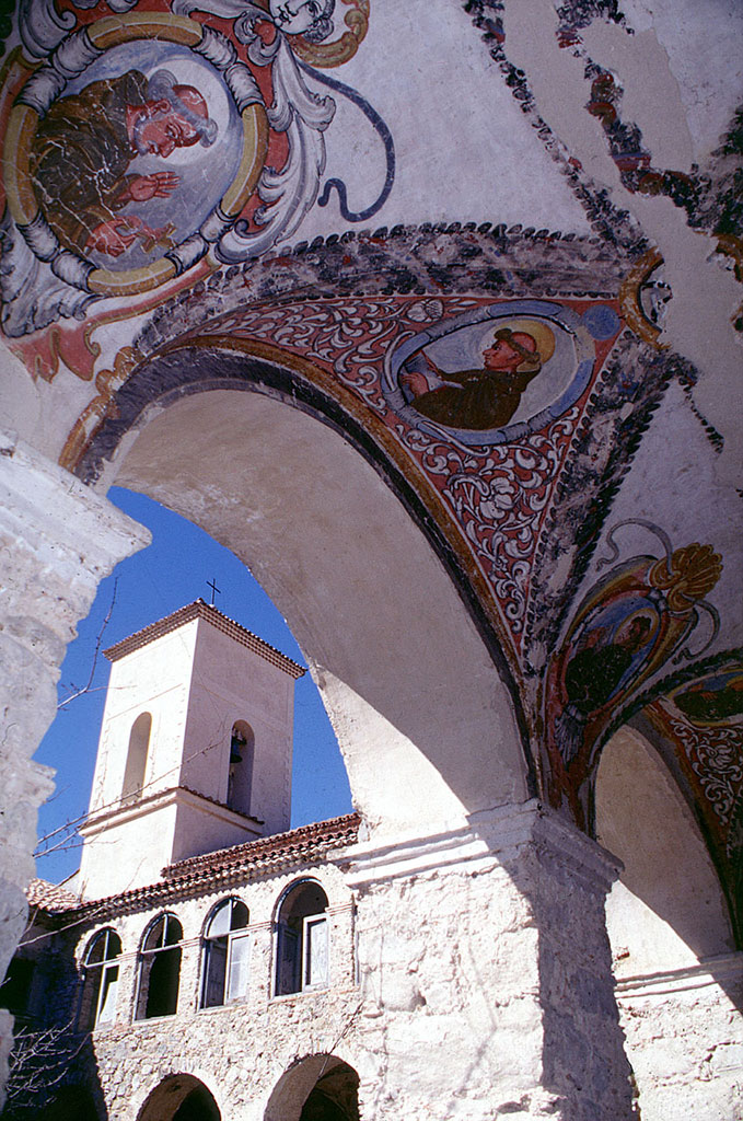 Questi ritratti fanno parte del ciclo di Santi vescovi, Dottori della Chiesa e Santi dell'Ordine che completa le "glorie" francescane dipinte lungo le volte e le pareti del chiostro. Affreschi sono stati eseguiti da un ignoto pittore locale che "mirava non tanto alla qualitˆ artistica delle pitture murali, ma, piuttosto, a rendere note le virt cristiane e a presentare la fede religiosa dei fondatori dell'Ordine" (Soprintendenza).