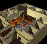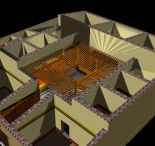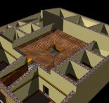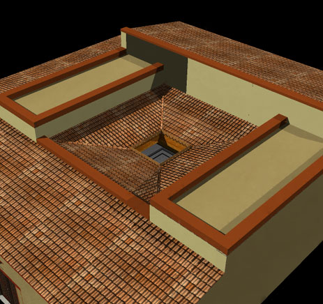 Per la copertura dei cubicula si è immaginato un tetto piano, per analogia con una casa di Pompei caratterizzata dalla medesima pianta. Allo stesso modo si é proceduto per la ricostruzione della copertura di Oecus, Tablinum e Triclinium. Più difficile è stato ricostruire la copertura delle tabernae e dei locali di servizio, a causa di una anomalìa nella pianta che suggerisce la copertura a spiovente raffigurata nell’immagine.