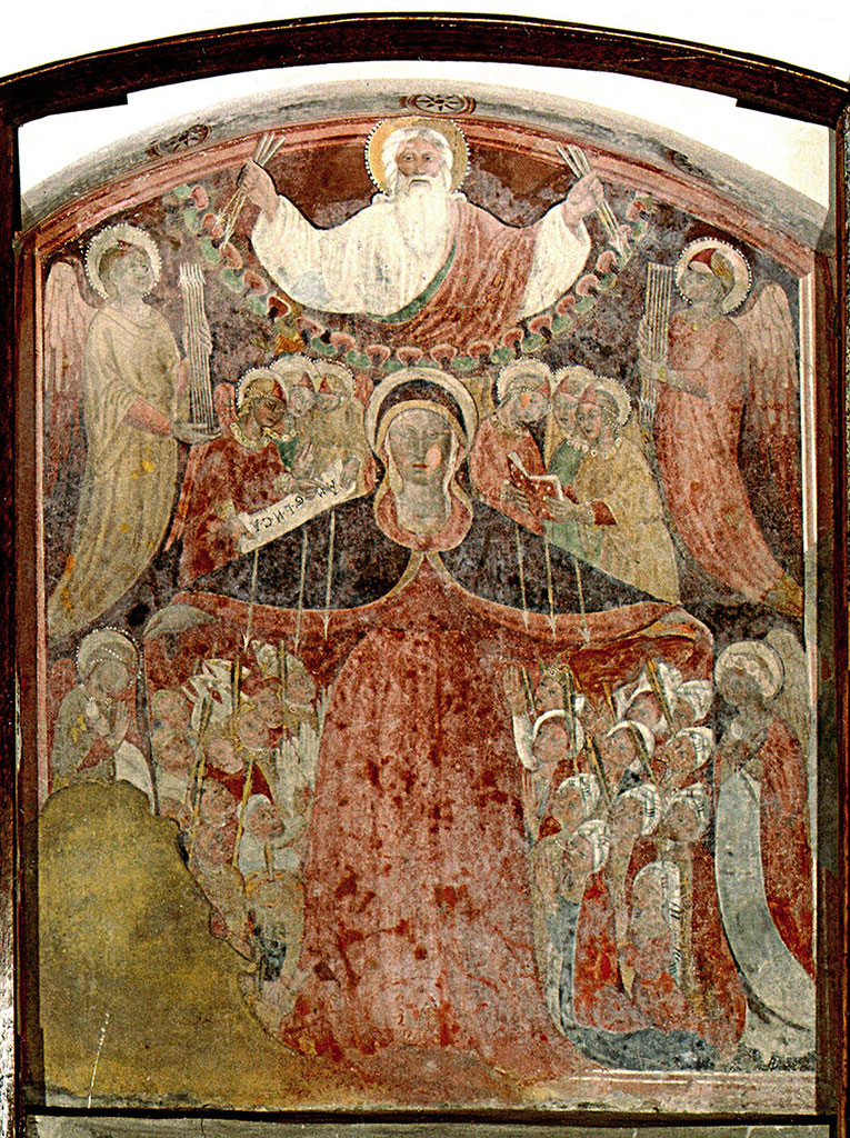 La Vergine, “in piedi, estende il suo ampio mantello sopra le sue braccia in croce per proteggere la folla di devoti inginocchiati; la protettrice è una figura di grandezza naturale, i fedeli sono piccoli. A destra e a sinistra del gruppo due angeli tengono delle banderuole con iscrizioni illeggibili.
