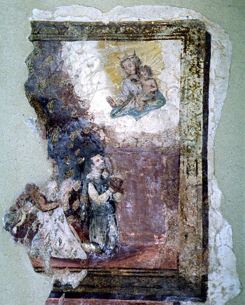 E' un frammento di un dipinto votivo che rappresenta un uomo inginocchiato davanti all'effige della Madonna per ringraziarla della protezione accordata al suo bambino, innalzato dalla madre, vestita di bianco, di cui si intravede soltanto una parte. Si tratta, dunque, di un ex-voto per una grazia ricevuta.