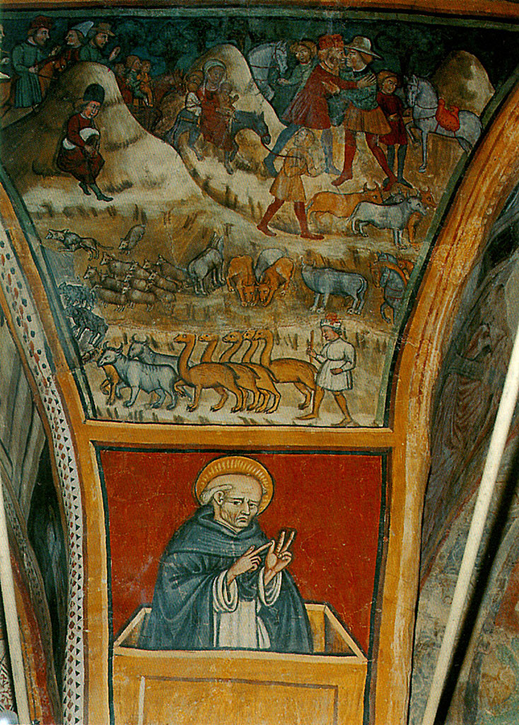 Nicola da Nova Siri, Abramo si separa da Loth (sopra), e Pietro di Giampietro, Santo (riquadro), affresco, XVI secolo il primo, XVIII secolo il secondo.
