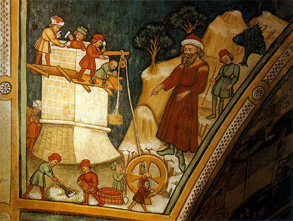 L'immagine documenta le fasi di lavoro di muratura:"vi sono operai alla ruota dell'argano, capimastri che sovraintendono, fabbricatori che sui ponti volanti allineano ed assestano i mattoni, mentre a spalla mastelle di calce che si impasta a piè d'opera." (Iusco)
